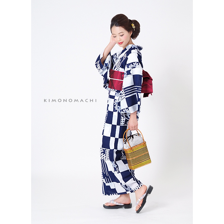 色味を抑えたシンプルな浴衣なのでどんな色でも合わせやすいのですが、とくにオススメの帯は明るいカラー。ビビッドなオレンジレッドの帯は浴衣によく映えて、古典柄もさりげなくオシャレな印象。中紅色の帯も、青×白によく似合います。露芝模様でちょっぴり大人っぽい表情に。