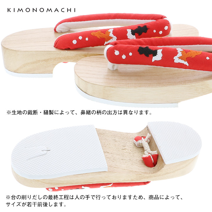 白木の台に、表地が鮮やかな赤色の鼻緒。鼻緒の裏側と中央部分は、表地とメリハリを効かせた白色。表の部分には、尾びれが白色の、朱色がかった赤色と黒色の金魚、水玉模様のような白色の水泡の刺繍入り。【サイズ】台全長約24.5cm/幅約8cm/かかと高さ約3.3cm